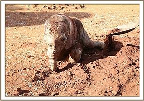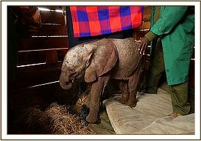 Delayed slightly by poor weather conditions, the helicopter arrived at the Nursery by 10am, sending clouds of dust into the air as it landed smoothly at the mud bath area. As soon as the engine had stilled the doors were opened and the Keepers laid eyes on a little red bundle, a bundle that couldn’t weigh more than 40kgs. Carrying the calf easily in their outstretched arms across the mud bath area he was laid in blankets in one of the warm stables and unwrapped. What was revealed was the smallest elephant ever to come into our care. It was thought this tiny baby must have been premature he was so small. He was immediately fed a fresh mixture of milk formula, which he hungrily accepted, before being put on a life saving drip.