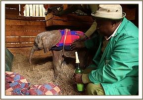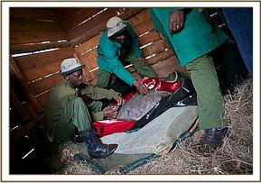 The ranger, who literally ran up the mountain to the area known as Suruan where the baby was still located, immediately took the calf into his care, bringing him inside the safety and warmth of the boma, covering him in blankets and making sure he was fed on nothing else other than rehydration salts until he could get the special milk formula needed for his survival the following day.