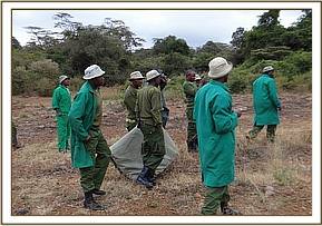 Equipped with a handheld radio the ranger immediately reported the incident to Helen. Helen, having rescued several elephant calves before, made a call to the The Sheldrick Wildlife Trust headquarters without delay, but realizing that the hour was too late for a rescue that day everything was planned for the next day. The ranger was then tasked with hurrying back up the mountain with the community messenger to collect GPS coordinates of the baby’s location to help with the rescue and continue to care for the calf with instructions from the Sheldrick Wildlife Trust.