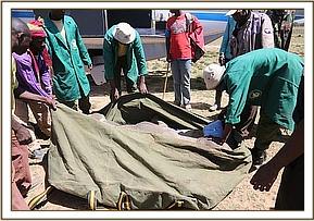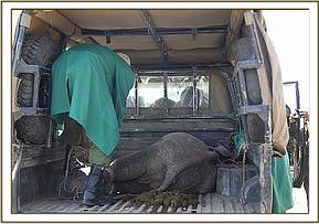 The approximately 15 month old elephant was being kept restrained and lying down in the back of a covered pickup. While talking to the men who rescued her it was ascertained that the calf had been recumbent from the time of her rescue at 6pm the previous evening and had not eaten or drank anything in over 18 hours. The calf was thin and weak and was unable to get to her feet. At this early stage the prognosis did not look good, and everyone felt that help probably had arrived too late. The Sheldrick Wildlife Trust Keepers loaded her into the plane as quickly as possible in order to waste no time giving her intravenous support throughout the flight. She was loaded into the aircraft, too weak to put up any resistance at all, with the assistance of the rescuers and willing community members all of whom were taking photos with their phones and looking to see what was being done and how the young calf was faring.