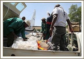 They were met by an ever increasing crowd, aside from her rescuers who had driven the calf to the airstrip to meet the plane, there were numerous community members converging, all extremely curious about the orphaned baby and wanting to know what had happened to her.