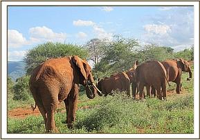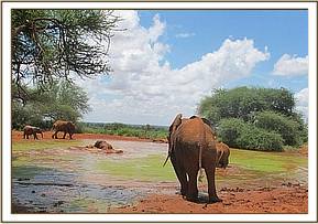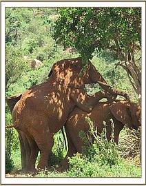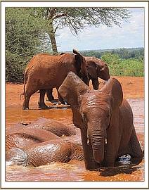 Lesanju led the Juniors out to browse as usual, all following her in a straight line. All enjoyed the wallow at noon, trumpeting happily. When Wasessa, Kenia and Lesanju exited the wallow and joined Lempaute and Dida in soil dusting, the Siria and Mzima went back into the pool while Ndii and Taveta scratched their bodies against a tree. The two boys joined them when they moved off to feed after the mudbath.