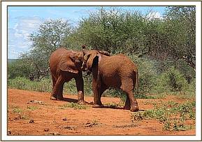 Light showers enhanced the mood of the Orphans, who enjoyed playing in the damp earth. Lesanju led her group to the noon mudbath, where playful wrestling took place – Tassia took on his great rival Taveta while Mzima engaged Siria and Lesanju played with Sinya. They browsed close to the waterhole for the rest of the day before returning to the Stockades in the evening.