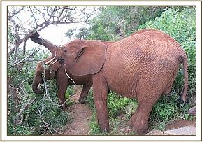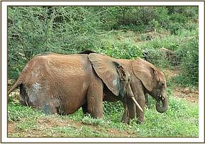 Layoni, Rombo and Kenia climbed the eastern side of the hill today to browse. Just before the noon mudbath Tassia and Taveta played a wrestling game while Mzima encouraged Layoni and Rombo to go higher up the hill, but the younger boys had their mind on their milk. When Mzima realized he would be left alone and knowing what the lions did to his friend Shimba, he ran to catch up with the others who were almost at the waterhole, where Wasessa demonstrated her skills, impressing all the others who tried to emulate her. Mzima and Rombo were last to come out while the others were already soil dusting, Tassia and Layoni digging up soft soil from the banks. A herd of wild elephants then emerged from the bushes and Lesanju rushed up to meet this friendly herd, whom the Orphans obviously knew well and whom they escorted to bathe. Meanwhile, back at the Stockades Edie turned up with a Splinter Group of Ex Orphans to have a drink at the Stockade trough. Mweya, Seraa and Icholta remained around the trough for some time while Edie and her baby enjoyed a dustbath near the fence.