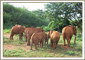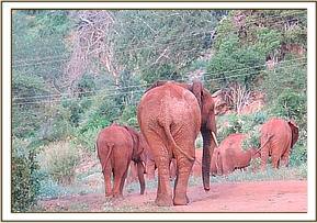 Once the Orphans had finished their handout, and passed by Shimba, they left for the field, Lesanju and Lempaute at the rear of the column, and the Keepers behind them. Today they plucked up sufficient courage to go quite deep into the Park, keeping close together and looking up to check on where their Keepers were. At noon the Orphans enjoyed a brief wallow and their milk before returning to feed again, the Boys leading the others closer to Mazinga Hill in order to access the Stockades before dusk, Tassia and Kivuko pausing at a small puddle on the way where all sprayed water over themselves briefly before resuming the journey home.