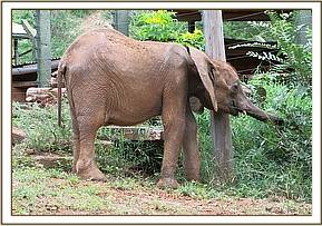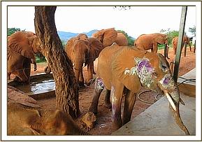 The Orphans emerged happily from their Stables, and took their supplements in an orderly manner, Panda walking along the fence scooping trunkfuls from each pile. Having finished, the Orphans went about their normal games, Rombo and Layoni again chasing one another around the compound, and charging the baboons. Later all headed to the Hill to browse, feeding first at the base and gradually working their way to the top. At 3 p.m. they began coming down and by the time they reached the Stockades it was 5 p.m. and after having their milk and taking water, it was time to go in for the night.