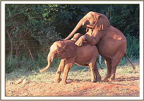The orphans came to rumble to Shimba in his Stockade before enjoying their supplements. Panda joined Shimba in his Enclosure to share his hand-out, thereby avoiding the noisy boys who become greedy at such times. Having taken their supplements, Wasessa played a rolling game, which attracted Panda who climbed onto her back, swinging her trunk happily. Wasessa is paying more attention to Panda and has become less possessive and selfish since the absence of her favourite baby, Emsaya. For the first few days after the loss of Emsaya Wasessa head butted the boys and disobeying the Keepers, but everyone understood the reason that she was so upset. She mourned the loss of Emsaya for about a week, but then gave up when she realized that her baby was not going to return. The Keepers wished she could understand that her baby was safe and lucky to have not ended up like Shimba!