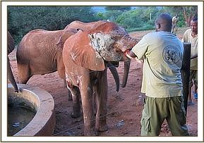 The day began with Shimba having his wounds dressed as usual and although painful, Shimba understands that the Keepers are only trying to help him, and does not resist. Antibiotic Spray and another layer of Green Clay is what is applied each morning when the Vet comes to check on his progress. The rest of the herd, still avoiding the eastern side of the hill, went up behind the Malaika house where they are sure of their safety. Lesanju and Tassia led the orphans to where there was a lot of vegetation, and since it was a cool day, they did not need to go to the mudwallow. At 11 a.m. the milk dependent babies came down to take their milk, after which Kenia led them back to join the others up the hill. Tassia climbed higher up where he used to browse with Shimba, while the rest remained together until it was time to return in the evening.