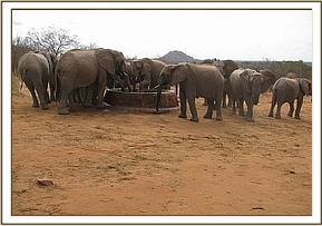 An hour after the Junior Group had left the Stockade compound, the ex orphaned herd accompanied by two wild elephants checked in. After taking water they all headed out following the direction taken by the Juniors meeting up with them at about 10 a.m. Again Nasalot immediately sought out Kilaguni, while all the others mingled happily, browsing together. All attended the mudbath, later scratching themselves against trees, Kilaguni and Nasalot sharing one tree! Later the Ex Orphans separated from the Juniors, and headed towards the West.