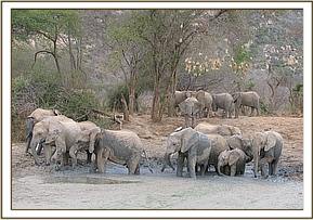 As usual the Juniors left the Stockades early. At the mudbath only Meibai, Kilaguni, Chaimu and Makena participated in wallowing, while the rest took water and waited for their colleagues to emerge from the wallow. They then all went back to feed in the Kone area until 5 p.m. when Kilaguni led the group back to the Stockades for the night.