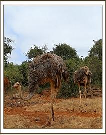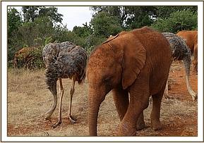 Mbegu had a great time with Pea and Pod in the field this morning. It was wonderful to watch these two different species interact and have fun together. Early in the morning in the forest as Mbegu was browsing and picking at some wild fruit, the two ostriches approached her and started feeding on the same things she was eating. Whatever Mbegu stretched her trunk to collect the ostriches took it before she could get hold of it. This went on for awhile until she abandoned those branches and decided to send the ostriches away. Pea and Pod ran away in different directions which left Mbegu confused over which one to run after. They then ran back to her and danced around in circles as Mbegu just stood and watched. They then laid their long necks on the ground and seeing her chance Mbegu ran at them both, trumpeting and with her ears raised up to scare them off. As she charged she dug her foot into the ground to show her real intentions. The ostriches got up in fear and ran off into the bushes. They pretended to have given up on the game as they watched Mbegu go back to browsing but suddenly they jumped out of the thicket and ran towards her. She shouted in a loud voice so that Arruba would run to help her. The entire herd looked up with their ears raised facing where they could see the ostriches running. After confirming that it was only Pea and Pod that had made Mbegu shout so loud Arruba just carried on browsing as Mbegu drove the ostriches into the bushes where they eventually gave up their game.