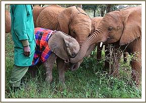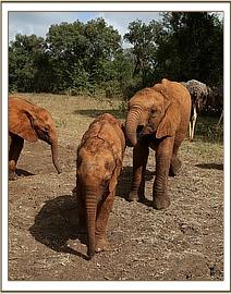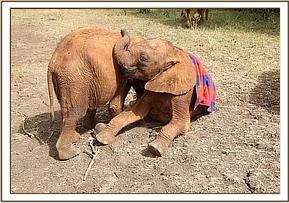 Today started off even chillier than the previous day! It was raining harder which meant that the little babies Ndotto, Lasayen and Ngilai wore raincoats over their blankets to keep them dry and warm. At around 7am the showers became a bit lighter and the big girls were happily enjoying soil bathing as they rolled, bumped and slid off one another. Suswa, the biggest girl in the Nursery, deliberately lay on Embu which caused her to shout out. Mashariki looked up quickly to see what was wrong with Embu and finding Suswa lying on her, pushed her off. Embu got up and walked off with Mashariki and put her trunk in her mouth, a sign of comfort and affection. As the two walked off Suswa was left rolling around in the soil on her own, quite happy to have the area to herself!