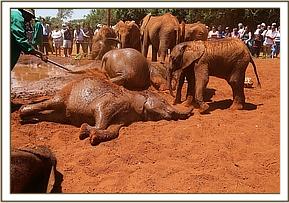 During public viewing, soon after the orphans had their bottles, Mbegu, Dupotto and Rapa had a fun time playing in the mud bath. They took their time with this game and Mbegu performed a dramatic display of walking out of the mud pool and sliding back in down the edge. Before getting up Dupotto and Rapa would try and lie on her like in a game of rugby. The three are certainly mud bath lovers!