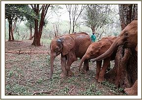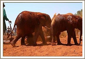 During the public viewing today it was pretty sunny, unlike the previous days which had remained chilly. Soon the first group had downed their bottle and Mwashoti, Rapa, Dupotto and Mbegu playfully entered the mud bath and took their time enjoying themselves. They all kicked around in the pool to make it extra muddy and better for mud bathing. They splashed and sprayed mud all over their bodies. Mbegu deliberately sprayed mud out towards the applauding public who also enjoyed watching their fun in the mud pool. The cheering of the public also saw Dupotto get out of the mud bath and start running after Pea and Pod who were busy feeding on green leaves around the grounds of the mud wallow. Dupotto wasn’t entirely successful though as the keepers warned her off, which saw her lazily get back into the mud bath again. As the second group of orphans were busy taking their bottles, Olsekki and Enkikwe were giving the keepers a hard time, running between them and trying to push the others aside so they could get more milk! Their actions made Suswa run out after Olsekki, who was bothering a keeper trying to feed Boromoko, and grab his tail and force him towards the mud hole until the other orphans had finished their bottles. Older elephants can discipline other orphans just as human siblings would do!