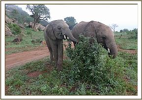 Laragai and her group spent the better part of the night wandering around outside. When they returned in the morning, they were accompanied by Orwa, Bomani, Vuria and Narok. The orphans were let out and the entire herd walked out to browse. Shortly later, they were joined by Mutara's group. Garzi picked a fight with Sities which went on for quite some time until Garzi gave up and moved to Kanjoro, thinking that he would be able to defeat him. However, Kanjoro fought tooth and nail to make sure that he wasn't defeated by Garzi. Garzi surrendered when the going got too tough for him. Turkwel settled to feed with Siangiki and from time to time stopped feeding to have a brief chat with her. Enkikwe settled to browse with Karisa while Maramoja settled to feed with Rapa.