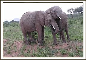 Laragai, Garzi, Kithaka, Barsilinga and Lemoyian who spent the night outside, joined their friends as soon as they were let out early in the morning. Barsilinga and Kithaka had a strength testing exercise for sometime before settling to browse. Shortly later, the juniors were joined by Mutara and her group. Kanjoro engaged Garzi in a pushing game as Sities settled to browse and have a chat with Maramoja and Rapa. An hour later, Mutara and her group parted ways with the orphans. At eleven o'clock in the morning, Kamok led Namalok and Karisa in the first group for their noon milk bottle. The mud bath was quiet without any wild elephants or Ex Orphans visiting. The orphans took sometime enjoying a cooling off exercise as Boromoko and Galla did their usual thing of climbing on the others. In the afternoon, the orphans settled to browse in the upper Kalovoto area until five o'clock in the evening, when Kauro led the first group back to the stockade.