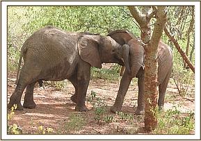 Soon after leaving the stockade, the orphans were welcomed by Zurura who had spent the night just outside the stockade. Zurura escorted the juniors out to where they began to browse. Enkikwe settled to feed with Sirimon while gala learned some pushing techniques from Zurura by engaging him in a light pushing game. Thereafter, Galla moved to practice what he had learnt on Boromoko. Enkikwe left to team up with Shukuru after Sirimon attempted to ride on him as Naseku settled to browse with Olsekki.