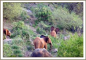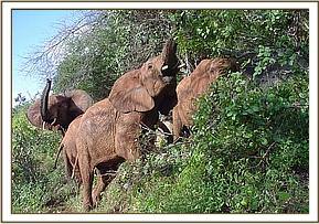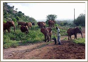Uaso appreared amoung a big group of about twelve elephants and joined the orphans at 4.30 pm. The orphans were unwilling to join the wild group on the foot of Masinga hill as they were browsing, slowing heading to the stockade. Mweya, Solango, Seraa and Mpala stayed away from Uaso who was trying to climb on them. Uaso accompanied them up to the stockade but later went back to the wild group once the other orphans were in their night stockades.