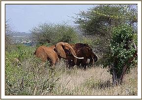 Emily, Aitong and Sweet Sally joined the orphans at the grazing grounds at 8.20am. The babies were unable to hide their delight as they ran trumpeting and rumbling to greet them. The greetings included running here and there breaking small shrubs with excitement. This came to an end when Aitong climbed on Moran who fell down screaming. The Keepers rushed to rescue Moran and this dispersed the orphans, who then went about feeding peacefully. Emily and her group left the orphans after the noon mud bath heading towards the Southern side of Mazinga hill.