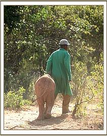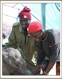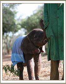Sabachi occupied the attention of Mawenzi, who previously had been attached to Kenia and Dida. The Keepers had a difficult time to try and prevent Mawenzi and Sabachi walking away on their own. Having not slept during the night, Sabachi was very weary, and kept lying down to sleep out in the bush, Mawenzi keeping guard over him. In the end the Keepers decided to cover the two with a red blanket so that they stood out easily whenever they wanted to be on their own, away from the other orphans.