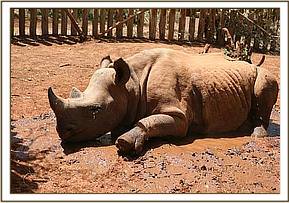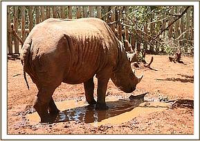 It was a very hot day today, so the Keepers made a little mudbath for the tiny rhino baby, Maalim. They then poured some water on his back to cool him down, and he immediately began to wallow joyfully, rolling around in the mud, just like a large rhino! They then dried him off by taking him to the loose soil and pouring it over his back. The problem arose when it was time to leave! He flatly refused, having had such a good time, and as the visitors would not leave the mudbath until he had gone, the Keepers had to physically lift him and take him away!