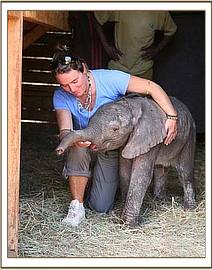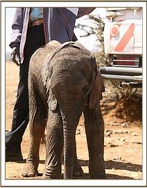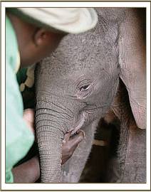For the third consecutive day a new orphan arrived, this time a newborn female from the Milgis area of Laikipia, who was flown into Nairobi in Helen Dufresne’s private plane. We collected her from Wilson Airport. She was newborn with very soft skin, and pink ears, and the umbilical cord was still attached, but dry. She was named Milgis, and plans were made to try and save her life by taking blood from one of the older elephants, and injecting plasma into her ear vein.
