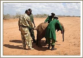 At 10 a.m. we received the alert that a baby elephant had been found on its own on Kulalu Ranch. At 12 p.m. confirmation came that the orphan had been captured, so the Rescue team left. The Voi Elephant Keepers were already with the baby near the Sala Gate and drove it to the airfield, where we fed it milk and rehydration. It was about 1 year old, and very dehydrated and weak, and not at all aggressive, which is usually not a good sign in an elephant newcomer of that age. We had to adjust the Sleeping Arrangements of the Nursery elephants to make space for the new baby called “Kulalu”. Turkwel and Kudup are the most flexible in this respect and made no problems during the night.