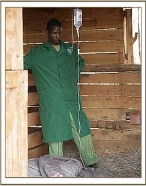 Kulalu went out as usual with his peers this morning, but suddenly began to tremble and fell down. The Keepers carried him back to the Stockades on the rescue tarpaulin, and put intravenous life support drip into an ear vein. After the first infusion, he was up on his feet, so we took him out a short distance to enjoy some sunshine, still on the drip. Mutara spent the whole day looking for little Kulalu.