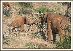 They briefly enjoyed some wonderful dusting games at the stockade before following Bada to the browsing grounds. Bada’s mission for the day was to lead the rest in a browsing session on Msinga Hill but was met with some resistance from Naipoki and Kihari, who by-passed him, leading the rest to the northern side of the hill. Here Suswa and Rorogoi separated themselves from the others while Rorogoi extended her trunk to grab some nice green grass right from Suswa’s mouth.