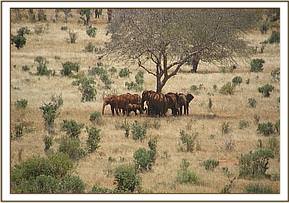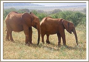 The orphans settled to browse in single file at the foot of Msinga Hill for one hour. A big wild bull passed close to the group and Tundani invited the bull to join them by extending his trunk in greeting. The bull joined them for a spell before making his way to the Voi River.