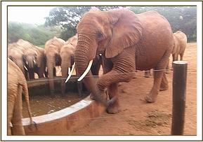 One hour after their departure from the stockade, Taveta came down from Msinga Hill and enjoyed a thirst quenching drink from the stockade water trough. Twenty minutes after his arrival, Emily, Eve, Emma, Mweya, Wasessa, Edie, Eden and a wild elephant bull arrived to join him. They had a wonderful relaxing moment with Emily anchoring her head on a big rock boulder.