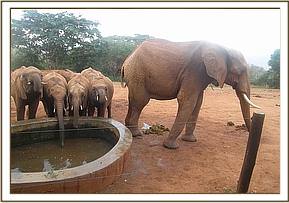 The orphans visited the water hole at noon. They had a brief bath before resuming with their browsing activities.