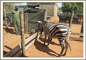 In the afternoon the Tsavo Mobile Veterinary Unit brought a small orphan baby buffalo to the stockades. The orphan had some diarrhea and was treated for this before being placed in a holding stable. Jamuhuri and Ngulia felt happy interacting with the new baby from the opposite side of the fence barrier. Jamuhuri felt a special attachment to the orphan as they were both buffaloes. She remained with the baby forcing the keepers to bring her Lucerne grass to where she was. Unfortunately the orphan baby buffalo died later that night.