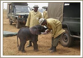 In the early afternoon a report was received by the Kaluku field HQ regarding an orphan elephant calf at the salt lick wildlife sanctuary. This orphan male elephant calf was approximately two weeks old and had fallen into the lodge septic tank and become trapped. The camp staff had heard the baby’s cries at around nine o’clock in the morning. No one knew when exactly the calf had fallen into the septic tank. A rescue team was organized and the calf was rescued at 1:30pm. It was desperate for company and was following the keepers and their vehicle. The orphan elephant was later air lifted to the Nairobi nursery.