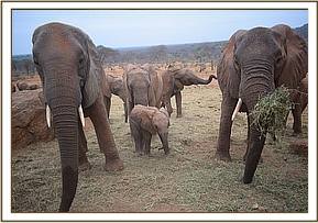 It was a busy morning today when some wild elephants and Ex Orphans came to share the lucerne. The dependent orphans came out after their milk and joined them. Some went to the water hole and some to the lucerne feeding area where the keepers were distributing the bales. Nasalot and Galana with their babies Nusu and Gawa were among the group. They interacted for short while as there was not very much lucerne to share out, and when it was finished, the orphans walked away and left the others to clear everything up.