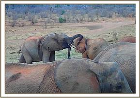 At mud bath time the orphans met with Kasigau who they played with after having their milk. Mutara’s group and a big group of wild elephants were also there. Mutara was scratching her belly on a fallen tree with Kauro, taking it in turns.