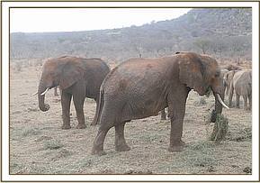 It was a chilly morning and Ithumba Hill was partly covered by mist. The orphans settled for lucerne and shortly later they were joined by Laragai and her group, Makireti, Kilabasi, Kasigau and Chaimu. Barsilinga was limping after spraining his front angle. It's suspected that he was injured during the foray with the lions attacked yesterday. The incident will remain in the groups mind for a long time and they certainly know now how dangerous a lion can be, especially to young elephants. Enkikwe was captured by the lion perhaps after he threatened it, since Enkikwe is known not to run but raise his ears whenever anything or anybody passes close to him. Laragai, who is always alert, is the complete opposite to Enkikwe. She flees anytime she detects something strange or dangerous around, even before setting eyes on it. The rest of the day was quiet. At mud bath time, the weather was still chilly and none of the orphans dared to step into the muddy water. Roi settled to chat with Naseku as they shared food from the same shrub. From the look of things, the two were discussing the current affairs and probably asking themselves, what they would do if suddenly a lion appeared.