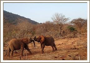 The orphans strolled nonchalantly out from the stockade and settled for lucerne. Outside the stockade Olare’s group was waiting as twenty five wild elephants concentrated on drinking water. The sky was crystal clear and this was an indication of a hot day ahead. After finishing their Lucerne, the orphans briefly joined the wild elephants to arm themselves with enough water to take them through the entire morning. Led by Kamok the orphans walked off east of the Ithumba Hill where they settled to browse. At nine o'clock in the morning, a pack of African wild dogs passed by, disrupting the peaceful browsing of the orphans. They scattered in different directions and ran away from the wild dogs. It took the keepers nearly half an hour to get the situation came back to normal by trying to bring all the orphans back together again. Sapalan, known for his quiet behaviour and silently dodging the keepers, was the last one to be found. Whenever Sapalan heard the keepers looking for him, he would stop feeding and stand still to make sure he wouldn’t create any noise to alert the keepers as where he was. By luck the keepers eventually bumped into Sapalan and directed him to join his friends.