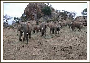Mutara’s group later joined the juniors. At mud bath time, the weather was windy and none of the orphans dared to go in the water. Tusuja had a brief chat with Turkwel asking how life outside the stockade was treating him, since in the near future he would like to join them. The sky cleared giving way to sun shine. The orphans converged under a tree while continuously flapping their ears. In the evening, Mutara and her group fed a distance away from the orphans. All over sudden something scared them, prompting a stampede in which the group headed to the stockade. Their stampede caused panic and tension amongst the orphans. The orphans couldn't wait for the unknown and so followed the Ex Orphans at high speed. Barsilinga who was limping, could hardly run and so dragged himself slowly and arrived safely late in the evening at the stockade. They stayed around the stockade for a while. We are not sure what scared them or indeed if there was anything and they just got spooked, but it is good they came back to the stockades for safety anyway.