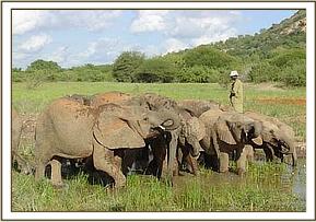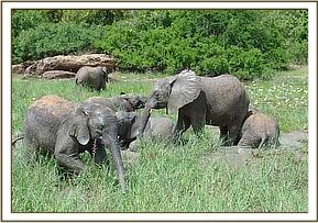 It was a very hot day, so the elephants had to cool themselves by flapping their ears. They were eager for the mudbath, and ran into it, enjoying it immensely.