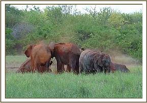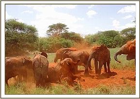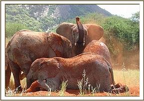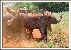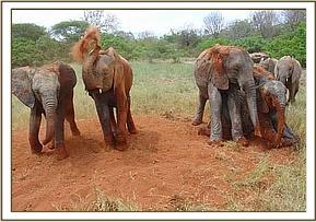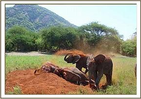 It was a chilly morning, so the orphans crowded together for warmth until the sun broke out at l0.30 a.m. Only Olmalo took a mudbath today; the rest dusted themselves with red soil