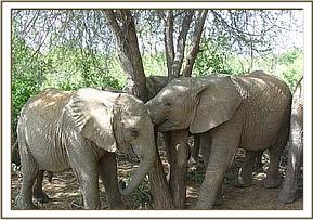 After leaving the Stockades, the elephants were in a jovial mood, playing together by pushing whatever they found on their way. Wendi pulled up a small shrub and tossed it in the air; Taita picked it up, then ran away with it, which annoyed Wendi who gave chase. When Taita saw Wendi homing in on him, he rapidly dropped the shrub and escaped.