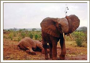 It rained last night, so the orphans left the Stockade in a happy mood, slipping as they descended the hill into the main Park. Upon reaching their feeding area, a brief celebration took place, as they rushed around kicking bushes. Natumi and Mukwaju dug up soil with their tusks, and threw it over their backs using their trunks. Natumi then went down on her knees, tossing her trunk skywards in joy whilst Mukwaju went onto a mound, and enjoyed sliding down with his mouth wide open! Because it was cool, the orphan declined to bathe, but Mweya, hoping to attract the attention of a filming crew nearby, took a stick and began to play with it.