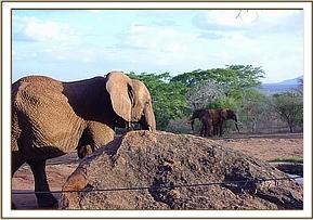 Emily and Tsavo arrived early in the morning to another very enthusiastic greeting from all the others, who spun round rumbling, trumpeting and urinating. Emily and Tsavo joined the other orphans for a short way, but then headed back past the Stockade towards the western side of the hill. Solango, Sosian and Salama sandwiched Mweiga between them, and kept a slow pace with her, whilst Laikipa, who was leading, began pushing the trees with his forehead, bringing the browse to a lower level for the others to utilize. At the mudbath Icholta occupied the best scratching position, so Mukwaju grabbed her leg in an attempt to make her move, which she did.