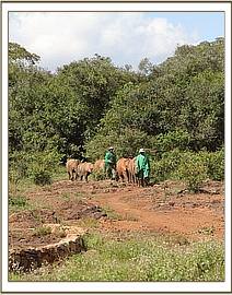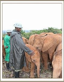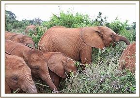 This morning the orphans seemed a little happier following the absence of Mutara, and the other Big Girls.   They moved out to browse, playing and knocking down small bushes.   The day was sunny and hot, so all enjoyed the mudbath, including the youngest, Lemoyian, and the oldest, Murera.   The weather changed in the afternoon with dark clouds threatening rain, so the babies were taken back in groups, the last being Kithaka, Kwale and Faraja.   Kwale did not want to go in, and ran back into the bush by which time it was raining quite hard.   The Keepers had a difficult time to round him up and bring him home in the rain.