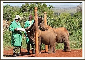 Narok is becoming more friendly to the Keepers, sucking their fingers, but Quanza, who witnessed the butchering of her beloved mother  remains suspicious of all humans, not even comfortable with the Keepers who feed her milk.   She gulps down her milk and then hurriedly moves away with outspread ears.