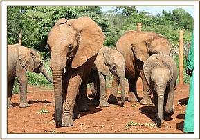 Kanjoro, who is the oldest Bull in the Nursery, and who is very pushy at milk feeds, today pushed down Kihari to try and snatch her bottle.   The Keepers attempted to discipline him by sending him to spend time out, but he merely turned his back on them and reversed until he had reached the others!   Kanjoro is currently training to go into the Elephant Moving truck along with Kilabasi, and he will soon be at Ithumba where he will be taught good behaviour by the bigger Boys.