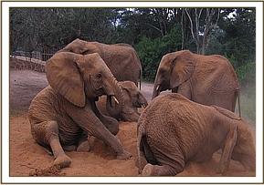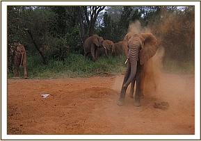 Ngasha led the orphans towards the Umani Hill so that they could browse until it was time for the midday milk feed and mudbath. At the waterhole all the babies had a lovely time wallowing and splashing everyone, everybody including the keepers, forcing them to move away and leave the babies to wallow freely. When the orphans were done with the mudbath they then whet to have a dustbath where they blew flames of dust into the air as they dried off.