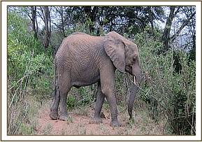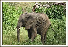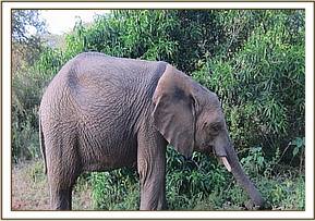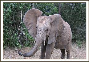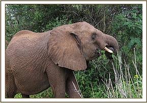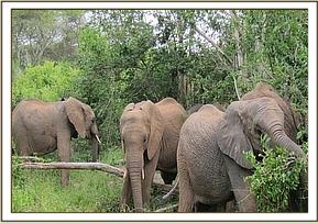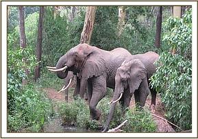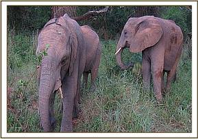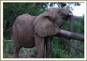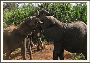The elephants walked to the bushes following the wild paths of their wild friends along to the water springs area. At the springs the orphans found some crocodiles enjoying the sunshine, but before the orphans reached the water the crocs jumped into the water to hide themselves. Some male bush bucks who were fighting over some females came running through the area where the orphans were standing, still deciding which way to go. Quanza and Ziwa raised their heads and looked at them running into the bushes. The fighting went on the bushes and it was quite unsettling for the orphans who were trying to browse, so they decided to move away and leave the fighting antelopes to it! i