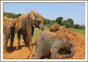The orphans were in a very charged and in a playful mood wanting to follow the wild elephants. Murera and Sonje were now tired and were having difficulty keeping up. The keepers could see that they were struggling and Mwashoti kept stopping and waiting for the two to catch up with the rest of the group until they reached the waterhole. They all had a lovely time in the mudbath wallowing and rolling around. Jasiri and Ziwa walked to the dusting point to get dry by tossing dust onto their bodies. Sonje lay down and allowed Alamaya to mount her back and it was not long before Mwashoti came and joined the fun, rubbing his belly over her back.